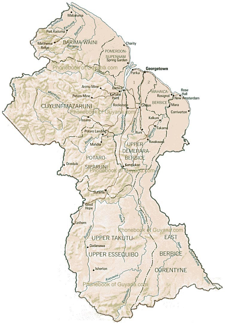 Detailed Map Of Guyana Large detailed map of Guyana. Guyana large detailed map | Vidiani : Guyana says it is seeking help from the U.S. to improve its defense capabilities amid fears that neighboring Venezuela might one day seize a disputed region in western Guyana that is rich in minerals . Map locates the region of Essequibo in western Guyana, as well Georgetown, Guyanaโs capital. It also locates Venezuela, Brazil, and Suriname, which surround Guyana. 100 miles Atlantic Ocean .